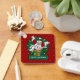 A funny snowman cartoon on a keychain or key ring for Christmas. Use "Personalize this template" to change the "Merry Christmas!" text and create a unique, customized item; text changes are reflected on both sides. It's maximum Christmas with this excited snowman dressed up as Santa Claus, jumping out of a Christmas present like a jack-in-the-box. The surprise gift is wrapped in gold paisley wrapping paper and a green ribbon with white snowflakes. An ideal stocking filler.