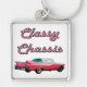 Grande chaveiro de metal de alta qualidade quadrada com uma imagem de um Cadillac rosado clássico e as palavras "Chassi clássico" (gíria de 50) em letras de bolinhas rosa e preto no estilo 50. Consulte botão quadrado correspondente e colar quadrado. Veja toda a coleção de Chaveiros Nifty 50 nos TOUCHES ESPECIAIS | Seção Favoritos para festas.