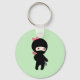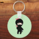 Ninja de desenho animado bonito está vestida de preto, mas para um arco cor-de-rosa sobre sua máscara de cabeça. A espada tradicional japonesa katana pode ser vista colada sobre o ombro, também colorido cor-de-rosa.