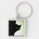 Gato preto vadio com olhos verdes esmeraldas olha por trás da parede preta para uma sala verde.