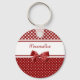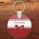Um chaveiro branco e vermelho giro com bolinhas brancas e vermelhas agudas na parte inferior, gingham chic na parte superior e embelezado com uma fita vermelha amarrada em um arco. Personalize este conjunto de na moda adicionando o seu nome. Esta é uma imagem impressa plana, não material real ou fita.