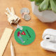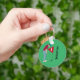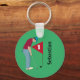 Golfista verde personalizado, vestindo um boné, camisa vermelha profunda e calças azuis, colocando uma bola de golfe em um chaveiro de buraco. Personalize o texto.