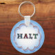 Kaychain com as letras HALT em um fundo branco e azul com quadro. Você pode personalizar isso adicionando seu próprio texto. As cartas lembram excelentes princípios.