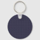 "Image showing the front and back of a circular keychain with a small geometric pattern in dark blue and red. Keychain has a metal ring and clear attachment, conveying a modern, stylish look."