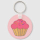 Cupcake de bordado de Faux. Chaveiros personalizados. Versão em segundo plano rosa. Ideia de decoração.