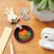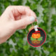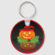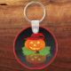 Esta é uma imagem de um Jack O Lanterna toda vestida. Uma abóbora laranja com bruxas vermelhas que está sentada em uma cama de folhas verdes. O Jack o Lanterna está iluminado com olhos brilhantes e um sorriso. Um fundo negro também foi adicionado para que você possa ver seu reflexo. Foi adicionada uma fronteira vermelha. Essas cadeias-chave estão disponíveis em estilos e tamanhos variados.