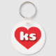 Esta cadeia-chave apresenta um coração vermelho vibrante contendo letras maiúsculas, brancas, arredondadas e em negrito, uma abreviação lúdica para o estado do Kansas, o estado do girassol.