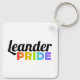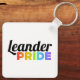 New Leander Pride logo keychain with black and rainbow lettering on white background