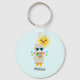 Um chaveiro personalizado com uma lama legal vestindo óculos escuros. Vestido num lenço listrado colorido e botas divertidas. Um sol amarelo brilhante com um rosto kawaii feliz no fundo. Triângulos brancos e coloridos rodeiam esta divertida lhama amorosa. Fundo azul.