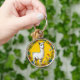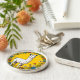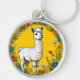 Lhama branca alegre em pé confiante contra um fundo amarelo vibrante. A lhama tem um casaco fofinho, olhos expressivos e a cabeça ligeiramente erguida, dando-lhe uma aparência amigável. Ao redor da lhama há uma grinalda floral circular composta por flores coloridas, incluindo margaridas, campainhas azuis e outras flores, criando uma moldura animada e alegre. O tom geral da obra de arte é lúdico e caprichoso, combinando elementos da natureza com uma figura animal encantadora.