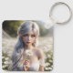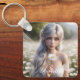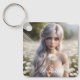 Uma bela fada de cabelo prateado com asas transparentes vestindo um vestido branco bonito e joias de diamante segura uma margarida branca solteiro enquanto fica em um campo de margaridas. O texto pode ser facilmente alterado ou eliminado se pretender que a imagem fique sem texto.