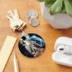 um chaveiro com uma fotografia de um filhote de lobo uivando com um lobo adulto ao fundo também uivando. também ao fundo está uma fotografia da Terra e da Lua.