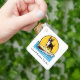 Keychain gift for anyone who loves their Boston Terrier family pet in a fun design with graphic of a Boston Terrier riding a surfboard on a wave in a beachy design that is fun and colorful.