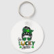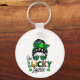 Esta é uma corrente chave divertida para celebrar a Rua com a design com uma mulher com o cabelo em um pão vestindo óculos de sol e as palavras "Um Lucky Lassie".