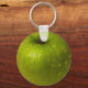 Vista aproximada de uma maçã verde solteiro. A maçã está molhada e muito coberta de gotas de água limpa. Chaveiro engraçado.