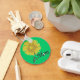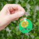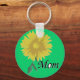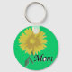 Esta imagem é de uma margarida amarela em um caule com uma folha verde. A palavra "Mãe" é impressa perto do fundo do design. Um plano de fundo verde foi adicionado a este design. Disponível em vários estilos e tamanhos desses chaveiros.