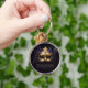 An elegant personalized keychain with a masquerade theme, featuring a gold masquerade mask with purple and gold accents, modern typography and a moody black and purple background, as well as elegant calligraphy. A lovely choice for a fiftieth birthday party in New Orleans, the Bayou or with a Mardi Gras, Nola theme, carnival, masquerade theme.