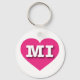 Este anel-chave apresenta um coração vibrante, rosa-quente contendo as letras maiúsculas, brancas, em negrito MI, a abreviação oficial para Michigan, estado dos Excelentes Lagos.