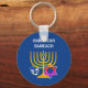 Chaveiro de HANUKKAH moderno, na moda, projetado com uma menorah falsa de ouro, estrela colorida de David e sonho branco mais GREETING PERSONALIZÁVEL - HANUKKAH SAMEACH, para que você possa criar sua própria saudação, por exemplo. Feliz Chanukah. Ideal para a época de Hanukkah como presente de favor ou refeitório. Escolha entre uma ampla seção de roupas e presentes de Chanucá, desenhados por Designs Bereanos. Presentes correspondentes disponíveis.