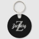 Este chaveiro personalizado apresenta um nome de script retrorativo branco e inicial de um monograma de cinza clara em um fundo preto. Um design simples, mas distinto para um homem ou uma mulher.