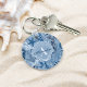 Esta cadeia-chave de praia de verão, inspirada no oceano, apresenta um padrão de vida submarina como conchas, cavalos marinhos, corais, águas-vivas e estrelas-do-mar, com uma concha de couro cabeludo definindo o nome inicial do monograma e o nome do script.