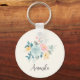 Um chaveiro com uma ilustração bonito de aquarela. Um buquê de flores cor-de-rosa e azuis cercado por folhas verdes e galhos.