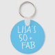 Chaveiro de aniversário moderno e na moda com 50 anos com o texto cinquenta e fabuloso em um roteiro elegante azul brilhante. Basta adicionar seu nome a este chaveiro personalizado de celebração de 50 anos. Presente perfeito de aniversário para um moderno, na moda e elegante de 50 anos. Desenvolvido exclusivamente para você pelo Happy Dolphin Studio!