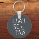 Chaveiro de aniversário moderno e na moda com 50 anos com o texto cinquenta e fabuloso em um roteiro elegante fora de preto. Basta adicionar seu nome a este chaveiro personalizado de celebração de 50 anos. Presente perfeito de aniversário para um moderno, na moda e elegante de 50 anos. Desenvolvido exclusivamente para você pelo Happy Dolphin Studio!