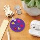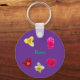 Um porta-chaves de círculo de alumínio=opcional, com uma imagem de um tulipa amarelo, três rosas cor-de-rosa, personalizar="Nome"=texto verde médio, um tulipa vermelho, um narciso branco e amarelo, rosa#4, reduzido em tamanho, com o fundo removido, e uma cor Roxo Escuro, fundo adicionado por toda parte= (Imagens por P.J.M.) na frente.