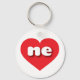Esta cadeia-chave apresenta um coração vermelho vibrante contendo as letras maiúsculas negras, brancas, arredondadas, e uma abreviação lúdica para o estado do Caçador de milho, Nebraska.
