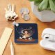 An illustration of a cozy creative evening: a woman drawing with a pen, coffee, and a sleeping cat, viewed through a heart-shaped window overlooking a city skyline.