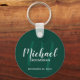 Adicione um toque pessoal ao seu casamento com padrinho de casamento personalizado. Este chaveiro apresenta o nome personalizado dos padrinhos de casamento no estilo de fonte branco moderno do script e monograma em estilo de fonte moderno esmerald verde claro como fundo com título e data de casamento em estilo de fonte branco moderno sans serif no fundo verde esmerald. Também perfeito para o melhor homem, pai da noiva e mais.