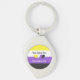 Metal keychain with the non-binary pride flag with little hearts in the center of the design. Black, purple, white, and yellow flag of the enby pride movement; with an editable text field for your name or message