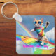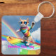 Uma imagem de alta qualidade, digitalmente reproduzida, com um gengibre antropomórfico e um gato branco numa pose de ação do corpo do cheio. O gato está perfeitamente equilibrado sobre um surfborato brilhante e colorido do arco-íris, seu olhar frio escondido atrás de óculos de sol refletores de lente laranja. Ele estiva uma manga furada de arco-íris de manga curta. A cena inteira é colocada contra um pano de fundo simples e pálido de cinzas para enfatizar as cores e o movimento marcantes do assunto.