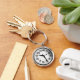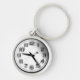 Não é o seu relógio. Está na hora. O tempo voa às vezes. A vida pode ser um borrão. A obra de arte original de ZoeSPEAK neste Chaveiro, de um relógio de parede com as mãos girando sobre números desfocados, está dizendo "Devagar. Leve o tempo para perceber a vida à nossa volta." As mãos e os números do relógio estão pretos, sobre um fundo branco. Uma segunda mão também está girando.