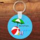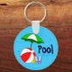 Uma corrente de chave de piscina com letras azuis retro e editáveis, frente e verso, e praia divertida ou piscina de natação, arte temática de uma bola vermelha de praia, guarda-sol verde, sandálias de férias e óleo de bronzeado em um fundo azul-aquático com ondas encaracoladas.