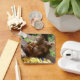 Chaveiro de orangotangos bonitos. Um lado mostra um carrinho de bebês orangotangos indo para a escola da selva na floresta tropical indonésia. O outro lado mostra um bebê orangotango pegando uma banana extra enquanto seu zelador prepara uma garrafa de leite para bebês. Estes orangotangos são todos órfãos no Centro de Cuidados de Orangutan, na ilha de Borneo. A artista é voluntária há muitos anos e doou 100% de seus lucros em seus designs orangotangos ao Centro de Cuidados e às causas de orangotango, como programas de reflorestamento em Borneo.