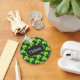 Um chaveiro personalizado com um padrão repetitivo fofo de trevas verdes em um fundo verde-escuro. Um quadro de vintage do rico, colocado sobre cima, com o dentro de texto. A armação tem uma falsa borda de folha de ouro.
