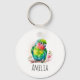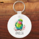 Chaveiro personalizado com uma bela ilustração de papagaio. Um pequeno papagaio verde com cores azuis e amarelas se misturando. O pescoço tem um tom vibrante de rosa avermelhado.
