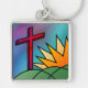 Um design de vidro manchado ilustrando a manhã da Páscoa, com uma cruz vermelha sobre colinas verdes ao lado de um nascer de sol feroz.