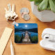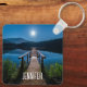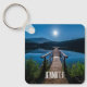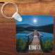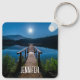Uma corrente chave com uma bela fotografia de um píer de madeira esticado sobre um lago calmo. O céu noturno coberto de estrelas e uma bela lua de cheio.