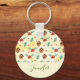 Corrente-chave com um padrão fofo com cones de pínus e holly sobre fundo de aquarela amarela com pequenos círculos brancos espalhados por aí.