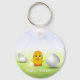 Ilustração de Páscoa bonita: o pintinho nasceu de um ovo e estava sentado ao lado das cascas de ovos quebradas.