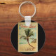 Um impressão de arte da Flórida de Pompano Beach, do século médio único, no estilo poster viagens vintage. Ele apresenta uma palmeira curva na praia arenosa com oceano sob um céu azul nublado.