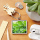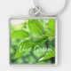 Esta chaveiro encoraja-o a 'Viver Verde'. Apresenta um close de luxuosas folhas verdes de verão depois de uma chuva. ~ Parte da coleção verde. ~