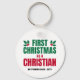 Na moda PRIMEIRO NATAL COMO UM chaveiro CRISTÃO novo com TEXTO E DATA PERSONALIZÁVEIS. A design mostra a tipografia serif verde-natalina e vermelho-natalino com elementos vermelhos e vermelhos holly. Um chaveiro festivo excelente para um novo crente cristão. Você pode PERSONALIZAR O TEXTO com seu nome, verso de Bíblia favorito ou outro texto e ano (ou excluir). Ideal como mercadoria de Natal da igreja para novos crentes celebrando seu primeiro Natal cristão. Estes podem ser dados como estocadores e presentes favoritos. Presentes correspondentes disponíveis.