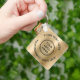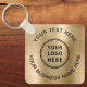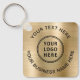 Chaveiro de promocional simples para sua empresa ou organização em um fundo metálico falso em ouro escovado. Adicione seu logotipo ou código QR e duas linhas de texto personalizado, como nome da sua empresa, slogan, obrigado ou deixe o vazio.