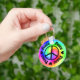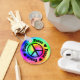 Chaveiro de Paz e Amor - sinal de paz e corações num fundo espiral arco-íris.