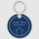 Este chaveiro moderno de corretor é personalizado com o nome da sua empresa real sob o nome do agente na tipografia quic. Esta cadeia de teclas marinho azul e branco minimalista apresenta um desenho simples de uma casa. Presente contemporâneo para um agente que trabalha para ajudá-lo a comprar de uma casa.