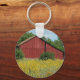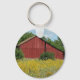 Foto original de um celeiro vermelho em um campo de flores amarelas.